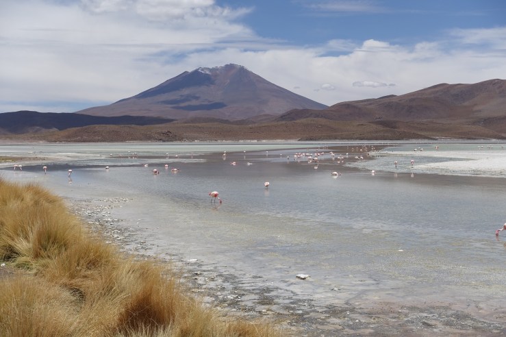 The second day was by far the most beautiful day of the trip. First we had the opportunity to visit an ancient city, where the pre-inca inhabitants builded their houses into fossilized corals. For some reason they were all dead (some believe it was an volcanic outbreak) and mumified due to the dry conditions, so you could see the mummies sitting in their homes. Another explanation was that this was a graveyard. Afterwards we headed trough another salt desert (by far not as big as the Salar the Uyuni) and had the chance to see an active volcano from some distance. The landcape changed all the time, and we saw mountains that displayed an unbelievable variety of colours, rocks that were shaped by wind and sand into surreal formations as well as green and yellow plains inhabited by Vicunias, Nandus, and Vizcachas. The absolute highlight were the lagoons. We saw four of them, one more beautiful than the other. Laguna Colorade was the largest, most colourful and most beautiful. It is inhabited by three different types of flamingos, which were feeding in groups of thousands in the lagoon.