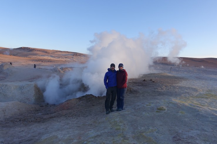 To see the geysers „Sol the manana“ we had to depart at 5 am on the next morning. We drove for nearly two hours and arrived shortly after sunrise. At 4850 meters above see level, it was freezing cold. It was the first time for Yves and me to see geysers and we were very impressed by the spectacle of nature. Pools of bubbeling mud were gurgeling and wholes spitting and hissing meters of steam. The following stop at the hot springs was a disaster, as so many people were there already, that our entire group decided, it would be no fun to spend the money and go into this tiny pool full with people. Instead we went directly into the direction of the Chilenian border. On our way we crossed other lagoons and arrived at the border at around 8.30 am. There we had to pay our tax for leaving the country😒 and changed onto a bus heading for San Pedro the Atacama in Chile. I have to say, Yves and I were happy the leave Bolivia, but the three days trip was very impressive and beautiful.