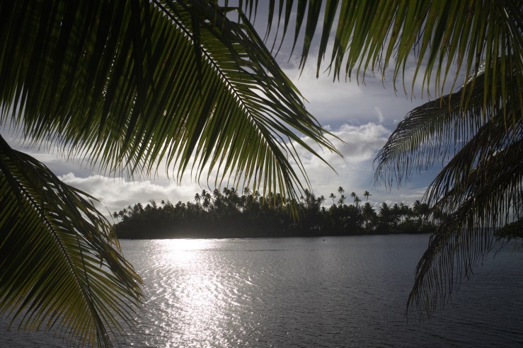 The sunset on Ra’iatea. The little islands are called “Motu”