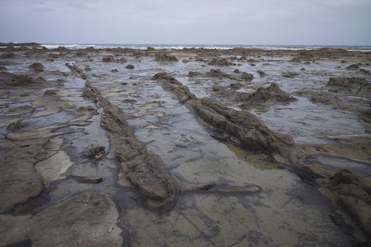 Fossilised tree logs on the beach.