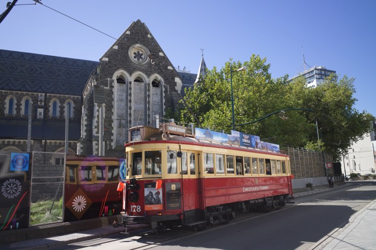 A tourist streetcar in front of the Cathedral in Christchurch.